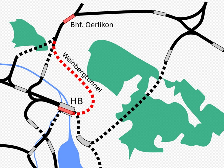 蘇黎世位于中歐的核心位置,其鐵路和公路樞紐聯(lián)系了德國(guó)、法國(guó)、奧地利和意大利四個(gè)國(guó)家。蘇黎世一帶屬于低山丘陵,地質(zhì)結(jié)構(gòu)復(fù)雜,鐵路和公路常需要經(jīng)穿越山脊的隧道相連。在蘇黎世北部,有一個(gè)重要的鐵路樞紐Oerlikon,北通德國(guó)巴伐利亞地區(qū)。此樞紐南部有三條鐵路隧道連接蘇黎世中心地區(qū):最老的Wipkingen隧道完工于1856年,Kaferberg隧道完成于1969年,最新的Weinberg隧道2015通車,連接了Oerlikon和蘇黎世最大的客運(yùn)站Hauptbahnhof(HB),其長(zhǎng)度近5公里,深度較深,一路行經(jīng)若干其他隧道(如Hirschengraben鐵路隧道、 Letten鐵路隧道、Milchbuck公路隧道等)的下方。