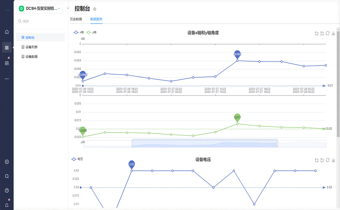 其貌不揚而低調(diào)的傳感器, 分別安裝在立柱橫梁頂端等各個不同的部位, 不知疲倦的發(fā)送信息到后臺,長期監(jiān)測護衛(wèi)倉庫的安全, 生產(chǎn)安全管理人員隨時可以通過手機,通過數(shù)據(jù)查詢,趨勢查詢,曲線走向,信息推送, 以及碰撞或者傾斜超閾值報警,隨時掌握動態(tài),及時排除隱患,控制安全風(fēng)險。物聯(lián)網(wǎng)登陸平臺